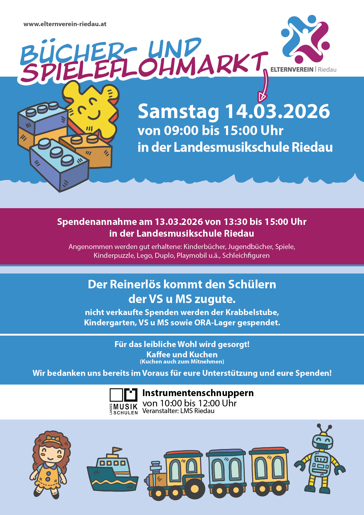 Die Spendenannahme erfolgt am 07.03.2025 von 14:00 bis 16:00 Uhr direkt beim Pfarrheim Riedau. Angenommen werden: Kinderbücher, Jugendbücher, Spiele, Kinderpuzzle, Lego, Duplo, Playmobil, Schleichtiere