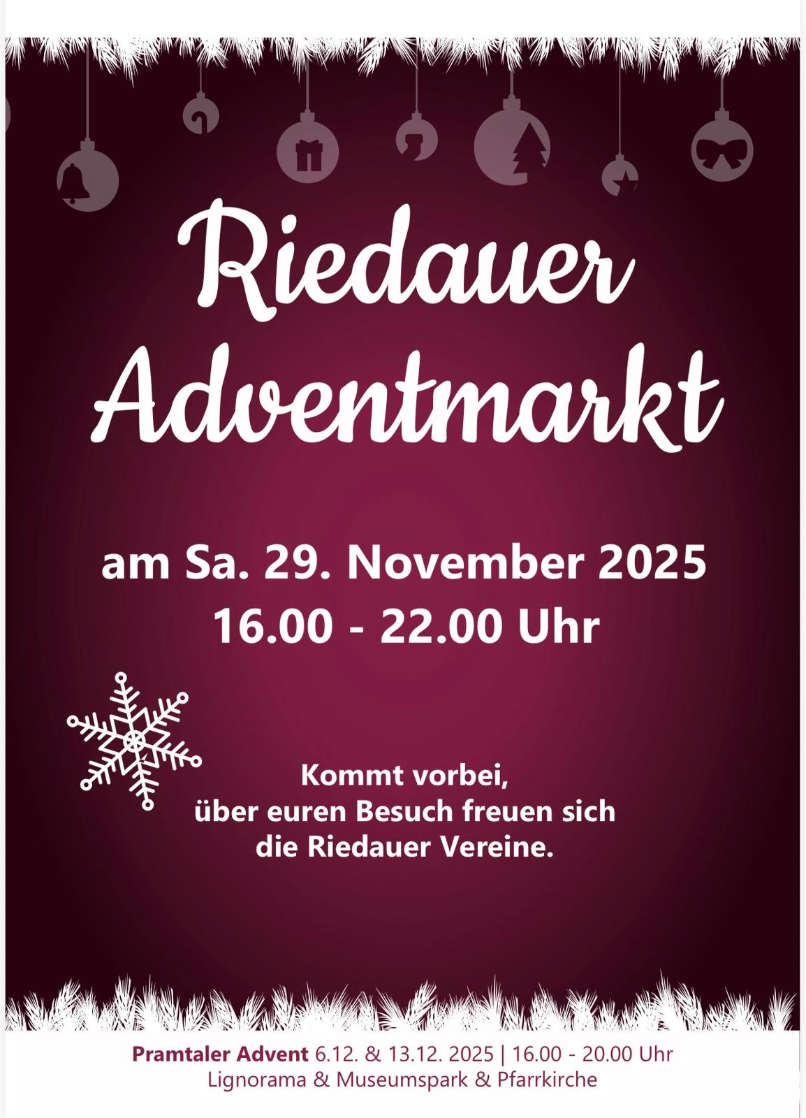 Adventmarkt der Vereine am 29.11.2025: Ein Spaß für die ganze Familie! Am 29. November ist in Riedau wieder Zeit für den jährlichen Adventmarkt! Mit einer gemütlichen Atmosphäre, köstlichen Leckereien und Angeboten für Jung und Alt verspricht der Markt einen gemütlichen Abend. Auch der Elternverein ist wieder mit von der Partie und bietet folgende Köstlichkeiten an: